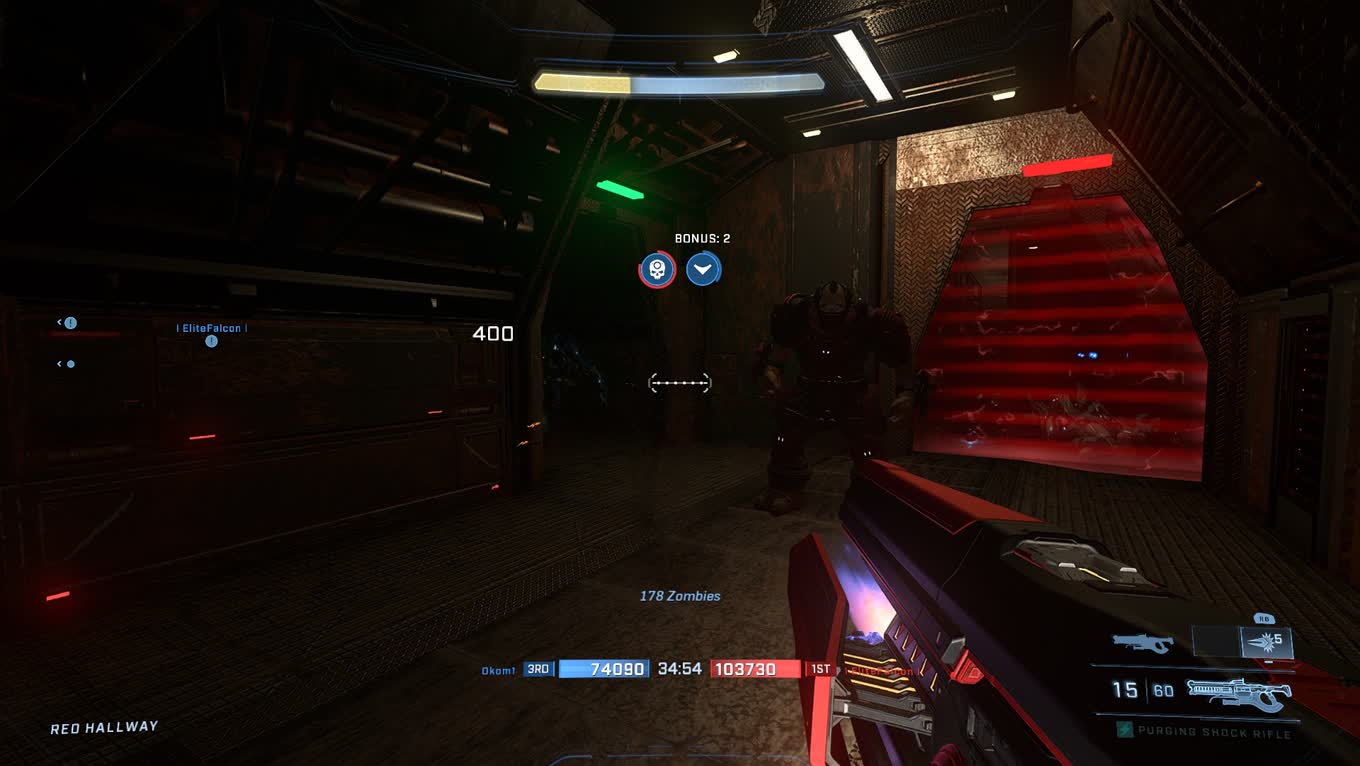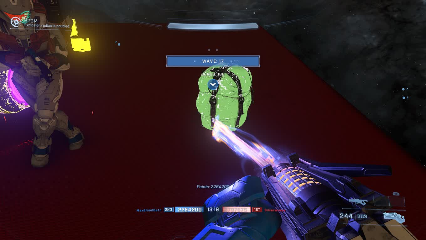 Shortly after EliteFalcon suggested to start cleaning up the grenades with his Gravity Hammer, so I switched roles with him to being primarily inside the map running around to find any dropped powerups to return back to the platform. That player's role was actually the most difficult as you had the risk of dying to the AI, and you had to constantly be looking around the map for the dropped powerups as any time a Nuke or Score Attack would be in the map, it would halt the exploit.