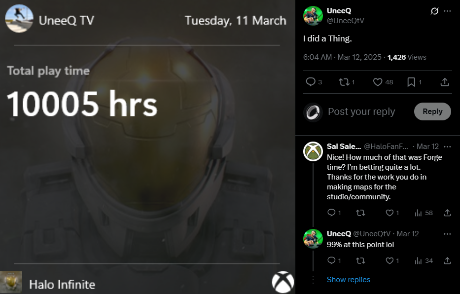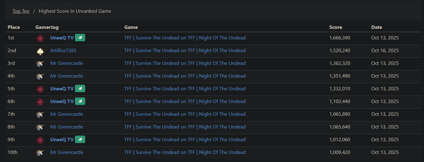 That was until the evening of Oct 17th, 2025—eerily close to a year after the original exploit was found—I got a DM from EliteFalcon asking me to jump in a call. He had been checking the top score leaderboards and seen that some players had jumped to the top of the charts with more than a million personal score—completely out of the range for a legit game. And these weren't just any players, they were some well-known top forgers: UneeQ TV, Artifice7285 and Mr Greencastle as well as CHL Shade, who was the first person to reach Hero rank in Halo Infinite.
