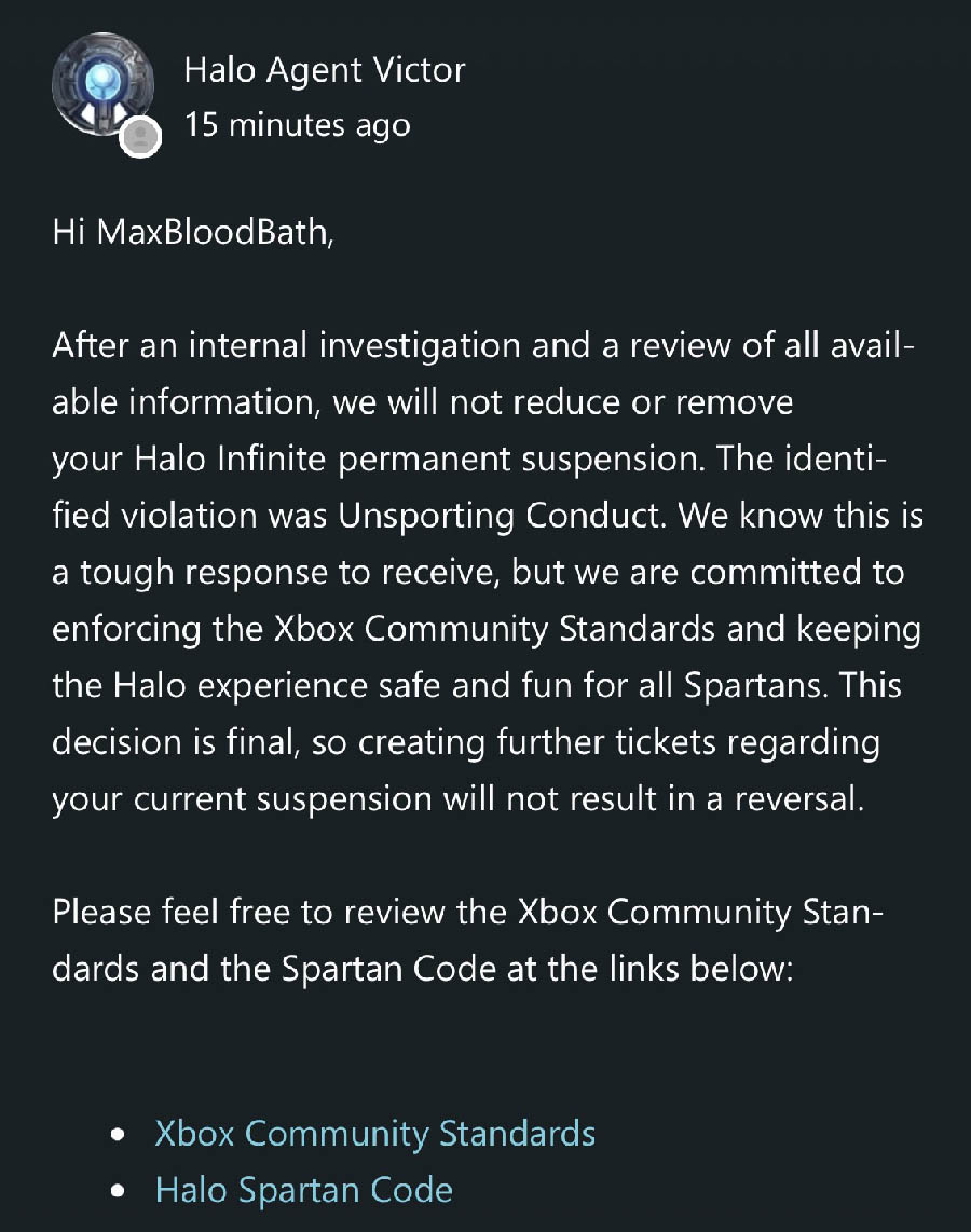 A disturbingly common topic with anything Halo Studios is involved with is a lack of communication, and this exploit along with the bans (presumably) handed out due to it are no exception. None of the members affected by the bans have been given adequate reasoning as to why they were banned, so we're all still just assuming it was due to this exploit. Keep in mind over half of the players affected were in a private Discord with Halo Studios staff who we've built professional working relationships with, and yet even we're being left in the dark about why we're banned from a game we've provided free content for over 3 years.