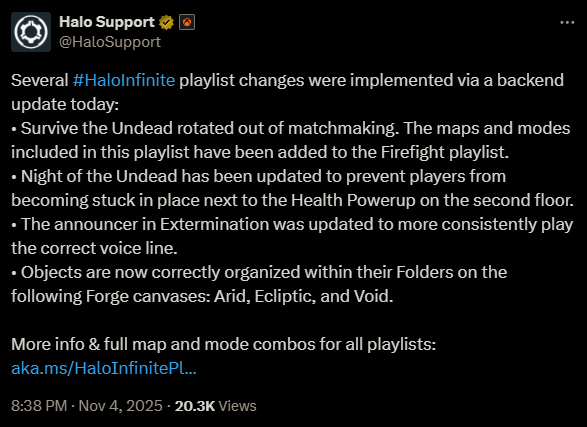 Even Halo Support on X chose to not mention anything about fixing the exploit on Night of The Undead, instead just mentioning a minor fix to the map in order to seemingly mask why the map needed to be removed from matchmaking for a few days. Usually maps which are a part of the highest performing and most popular playlist in the game don't get removed from matchmaking because players may accidentally get stuck in a corner.