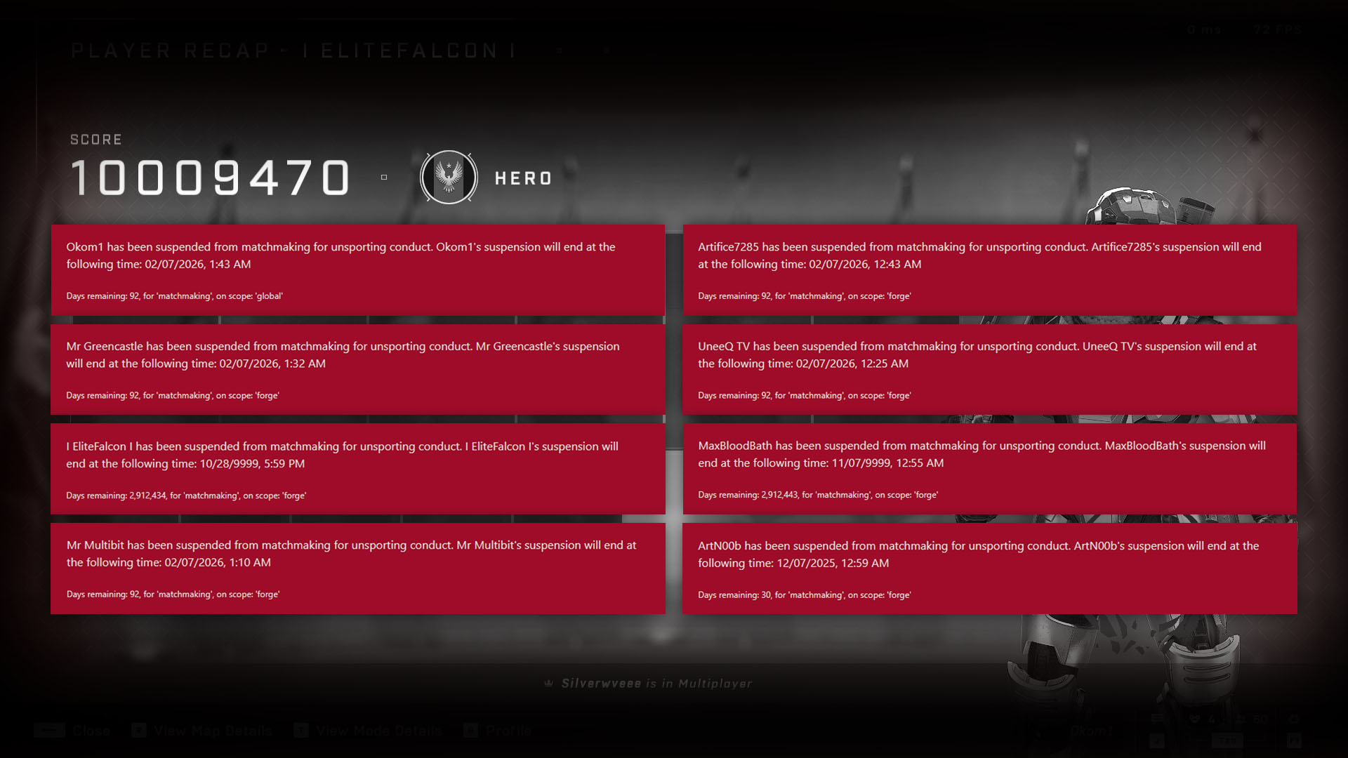 11 days after Worlds on Nov 7th, 2025, EliteFalcon hit me up in DMs at 0:32 UTC —"yo you up?". It turns out all members of The Forge Falcons had gotten removed from a private matchmaking forger Discord with no explanation. Of course, I thought it was related to the exploit, but why were only the TFF members removed? —there were still multiple other offenders. At 1:34 UTC, in-game bans were handed out. With still no explanation about what the cause of them were, 14 players were hit with Halo Infinite bans of various lengths.